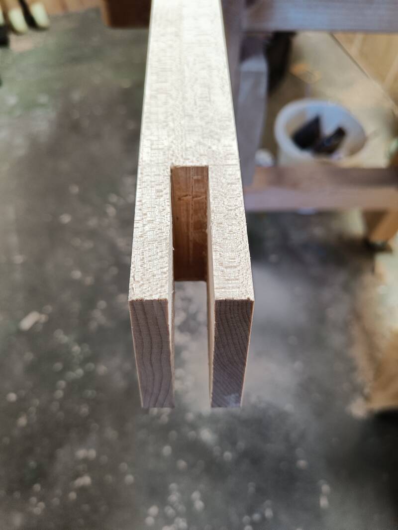Om de poten aan elkaar te verbinden heb ik gekozen om een slisverbinding te gebruiken, in een hoek van 15 graden. Deze zaag ik met de hand en werk ik af met een beitel.