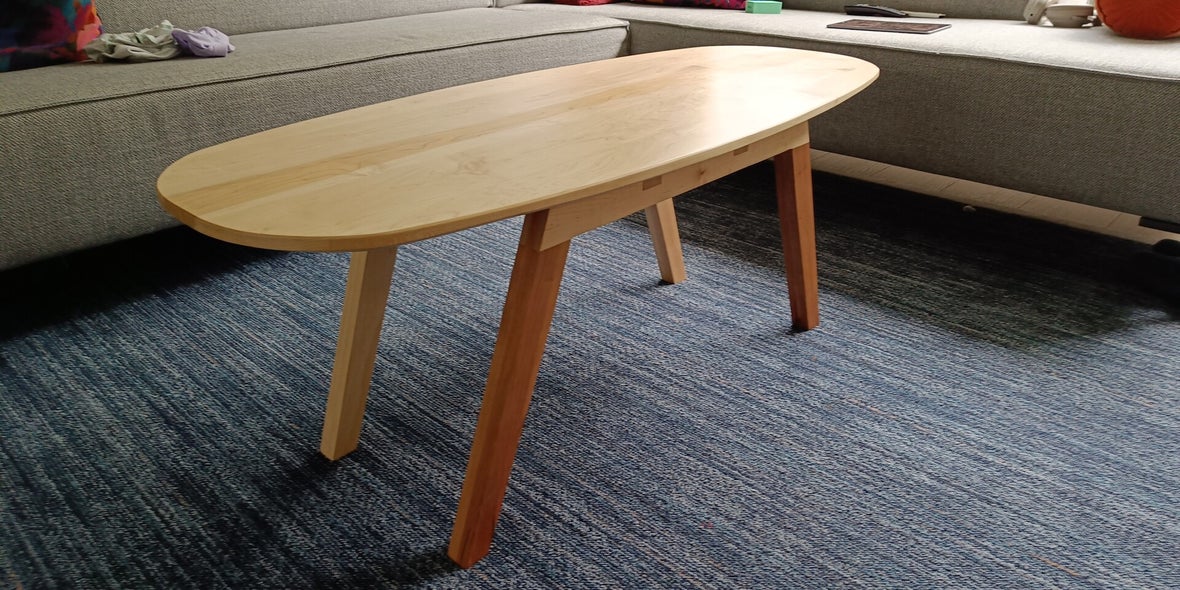 Deze koffietafel maken heeft veel tijd gekost, maar was het waard. De tafel is gemaakt van hard maple (suiker esdoorn). Twee poten zijn van kersenhout.